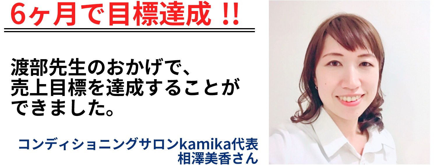 渡部先生は、結果につながる集客の方法はもちろんのこと、治療家としての心の在り方や私のクライアントさんに必要な治療技術を的確に教えて下さいます。 ただやみくもに売り上げを伸ばすことを目標にするのではなく、私とクライアントさんが幸せになるためには何が必要で、どんな生き方をしていくか、という視点を常に持ち、的確にアドバイスして下さいます。